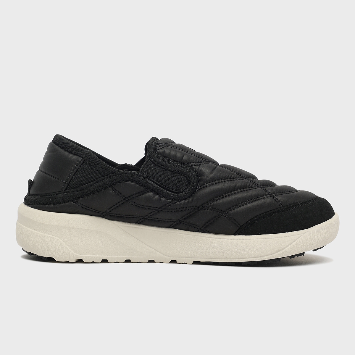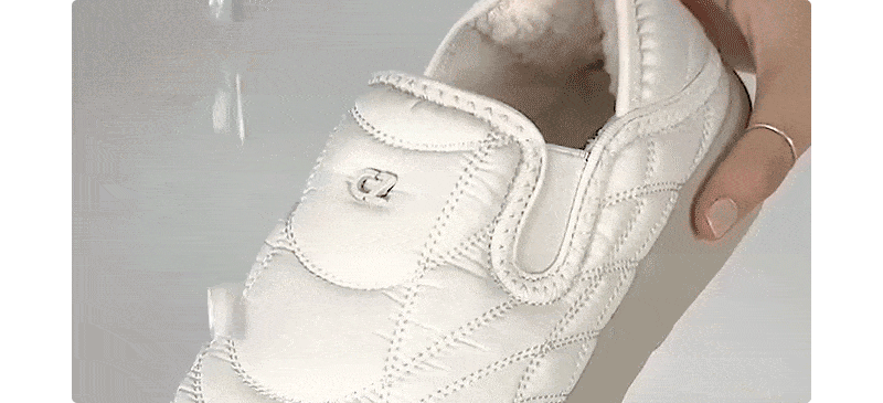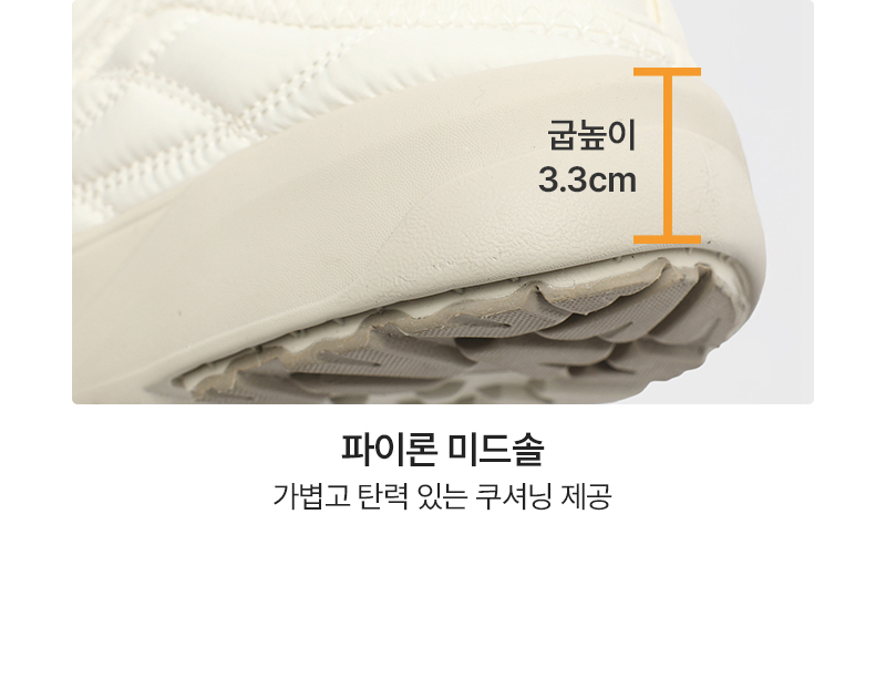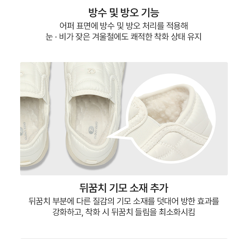 퀼팅 소재로 제작된 어퍼는 포근한 착화감을 제공하며, 내부에는 기모 내피와 기모 인솔을 적용하여 보온성을 높였습니다.