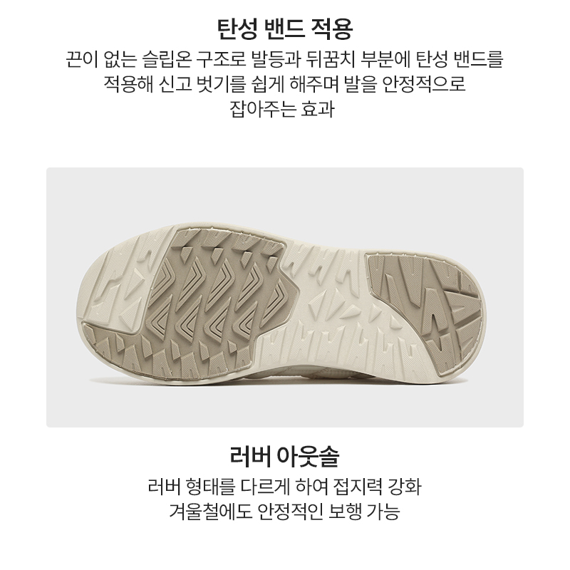 끈이 없는 슬립온 구조로 발등과 뒤꿈치 부분에 탄성 밴드를 적용해