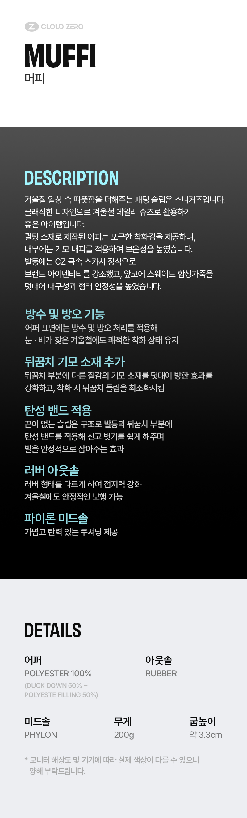 어퍼: POLYESTER 100% (DUCK DOWN 50% + POLYESTE FILLING 50%) / 미드솔: PHYLON / 아웃솔: RUBBER