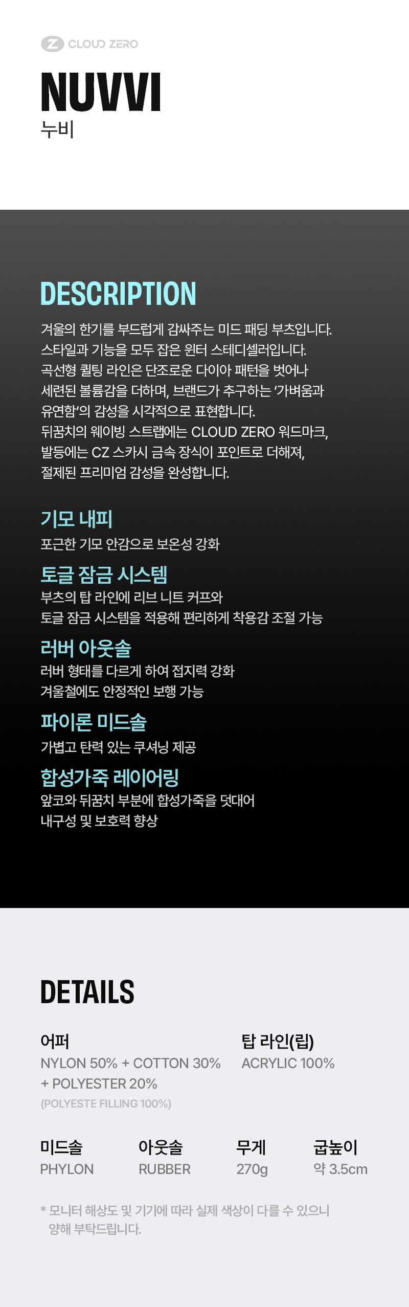 겨울의 한기를 부드럽게 감싸주는 미드 패딩 부츠입니다. 스타일과 기능을 모두 잡은 윈터 스테디셀러입니다.
